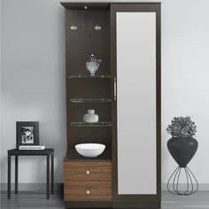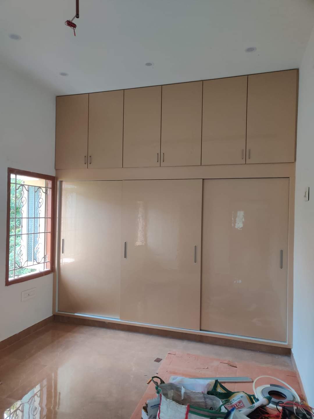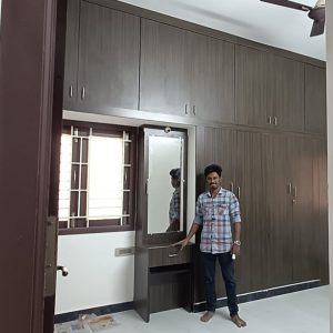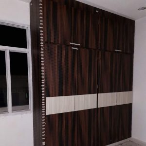 We use and suggest 18mm commercial /waterproof plywoods for wardrobes. Inner sides of the plywood are laminated with 0.8 mm white finishing mica’s. And outer visible sides are laminated with 1mm colored mica’s ( choice of us) or PVC lamination sheets. MDF (both side laminated) is a secondary choice of wardrobes and cupboards.